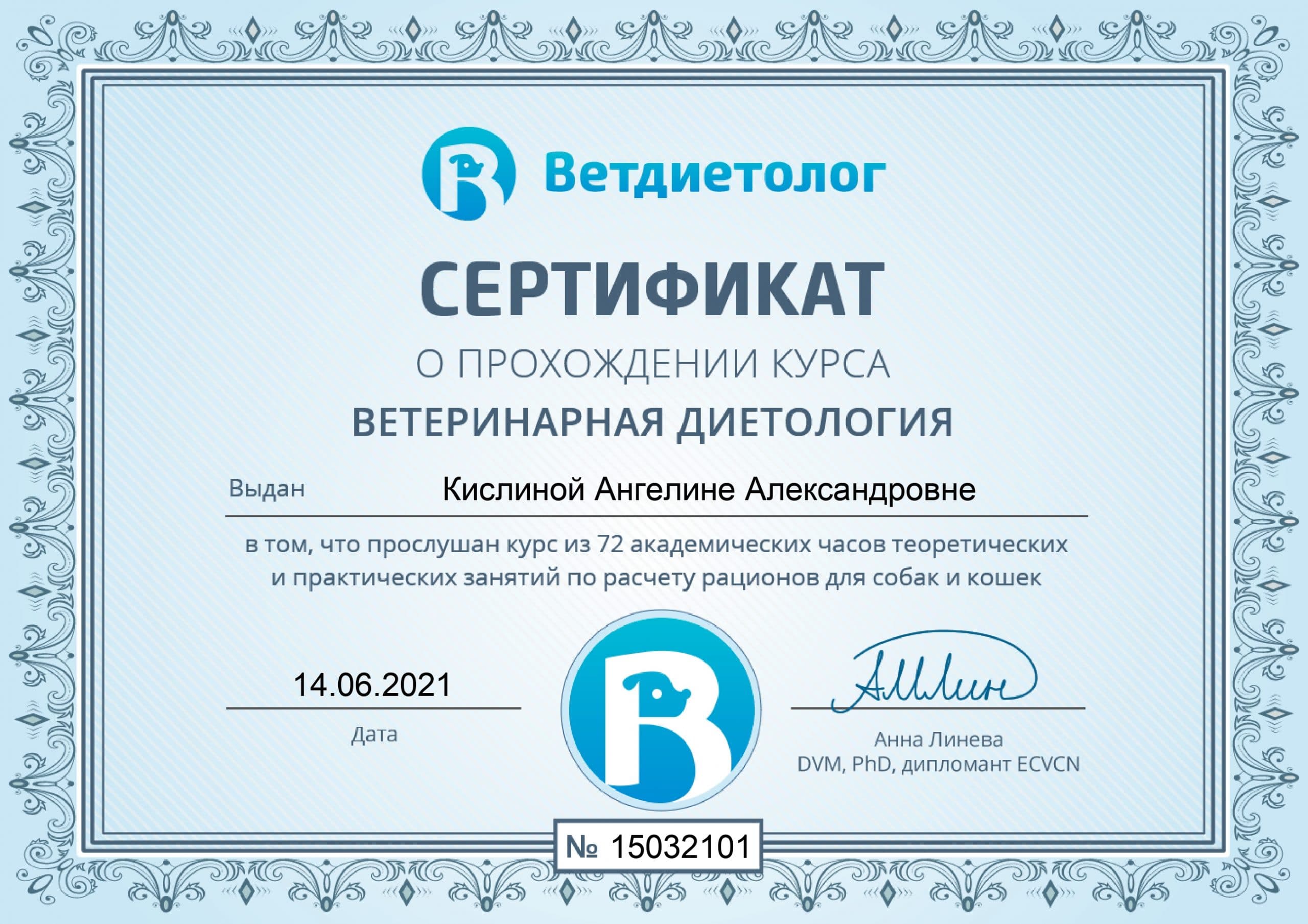 Добрый день! Меня зовут Кислина Ангелина, и я ветеринарный врач-диетолог. Я закончила Санкт-Петербургскую ветеринарную академию по специальности «Ветеринария». Продолжительность моего пути от ассистента ветеринарного врача до врача-диетолога составила 5 лет. Благодаря полученным знаниям я могу: 1. Анализировать рацион питомцев; 2. Подбирать готовый рацион сухих и влажных кормов; 3. Составлять натуральные и смешанные рационы; 4. Сопровождать котят и щенков в период роста; 5. Подбирать диетотерапию при различных заболеваниях. Но самое главное, теперь я могу рассказать владельцам животных, какую значительную роль играет питание в жизни наших любимцев! Для этого активно веду свой профессиональный блог в инстаграм: @dietolog.kislina